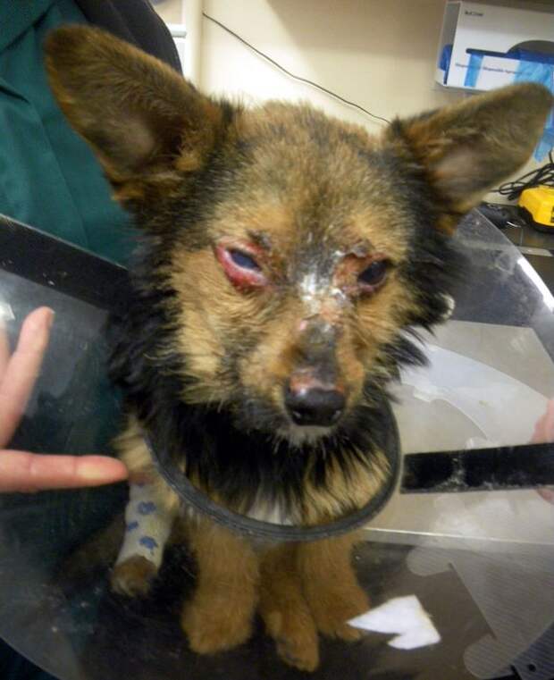 Сначала они били и гоняли её, потом сломали лапы и шею, подожгли мордочку и спину с помощью аэрозольного балончика, накормили наркотиками и напоследок, подумав, что щенок мёртв, выбросили его на помойку.Однако бедняга чудом выжил. Когда он очнулся, то в страшном состоянии ещё почти неделю ползал возле дороги и боролся за жизнь. Там его и нашли спасатели.
